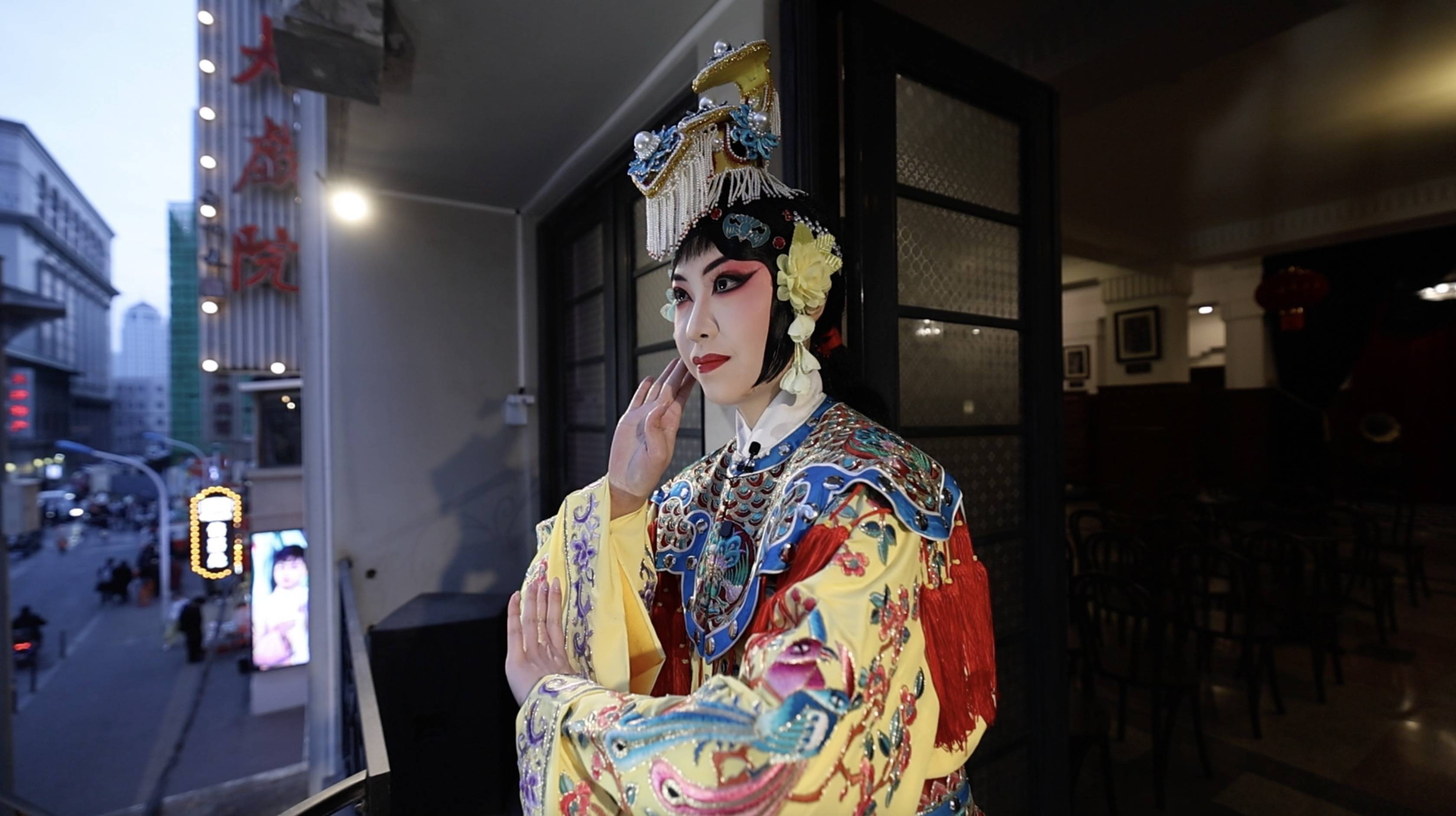 夜幕低垂,天津中国大戏院亮起灯光,勾勒出金色的轮廓。街道上,行人来来往往,殊不知一出好戏即将登场。鼓点声起,从大戏院二楼阳台传来,人们循声望去,只见京剧演员一身“虞姬”装扮惊艳亮相,“劝君王饮酒听虞歌”,婉转清越的唱腔引得路人纷纷驻足欣赏。
